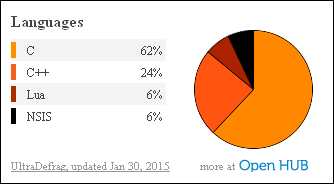 UltraDefrag core libraries are written in pure C for compatibility with Windows boot environment where only primitive ntdll interfaces are available. Both graphical and command line tools are written in C++ on top of wxWidgets library which helps to keep things simple. For configuration purposes and reports generation the program uses the Lua scripting language. UltraDefrag installers are written in NSIS.